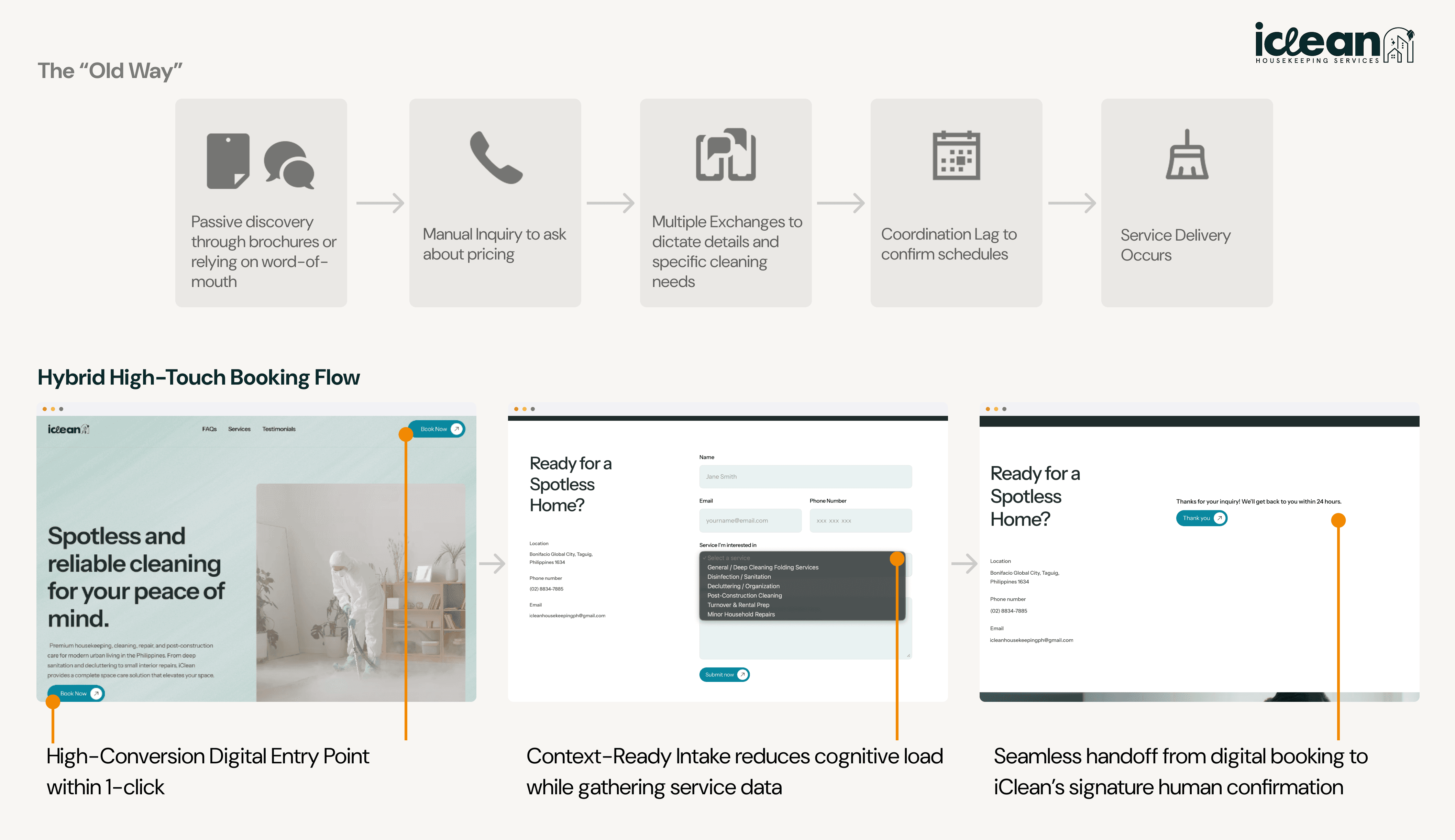 By mapping the legacy workflow, I identified that the primary bottleneck wasn't the cleaning itself, but the asynchronous information exchange. My design centralises data collection, allowing the iClean team to move straight from 'Inquiry' to 'Service Confirmation'.